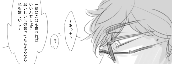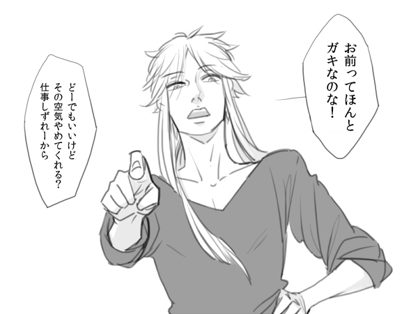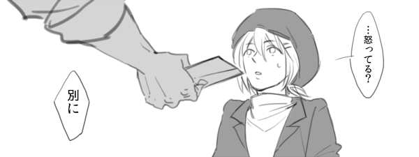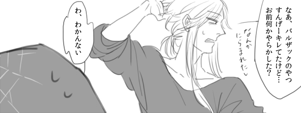 「でもそれ私に言ってきたのバルザックだよ?」 「いや、うん、マティは悪くない」 「・・・どうしよう」 「ほっとけばいいと思う、つうかほっとくしかねーな」 あんまりヘソ曲げてるとやおーさんにばっさり斬られるオチが待っている。 「バルザックはどーでもいいけどマティがかわいそうだから」 戻る